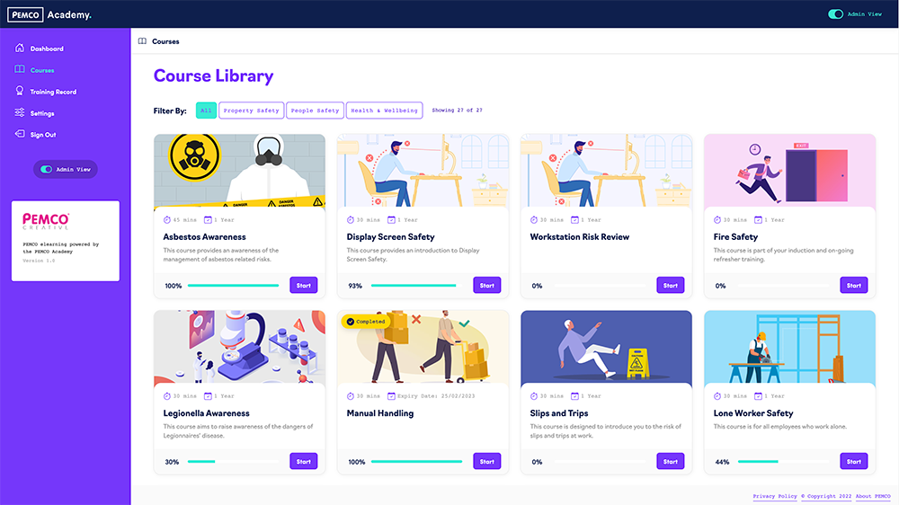 We are delighted to announce the launch of our new eLearning platform, PEMCO Academy, which is exclusively for use of our consultancy clients. Our new platform has had a complete design overhaul, a fresh new colour scheme, improved usability and is now fully responsive across all devices. We are so proud of the new platform that we couldn’t resist showing it off to everyone! Our Academy has over 25 courses on offer, from Fire Safety to Health and Wellbeing. All courses are written by subject matter experts and include quick quizzes, interactivities, and extra resources to maximise the learner experience. Our professional LMS allows you to keep track of all courses available, keep a log of training completed and download certificates. The Academy is exclusive to our consultancy clients so if you are looking for health, wellbeing or safety services, with the added benefit of our online training platform then get in touch to find out more!